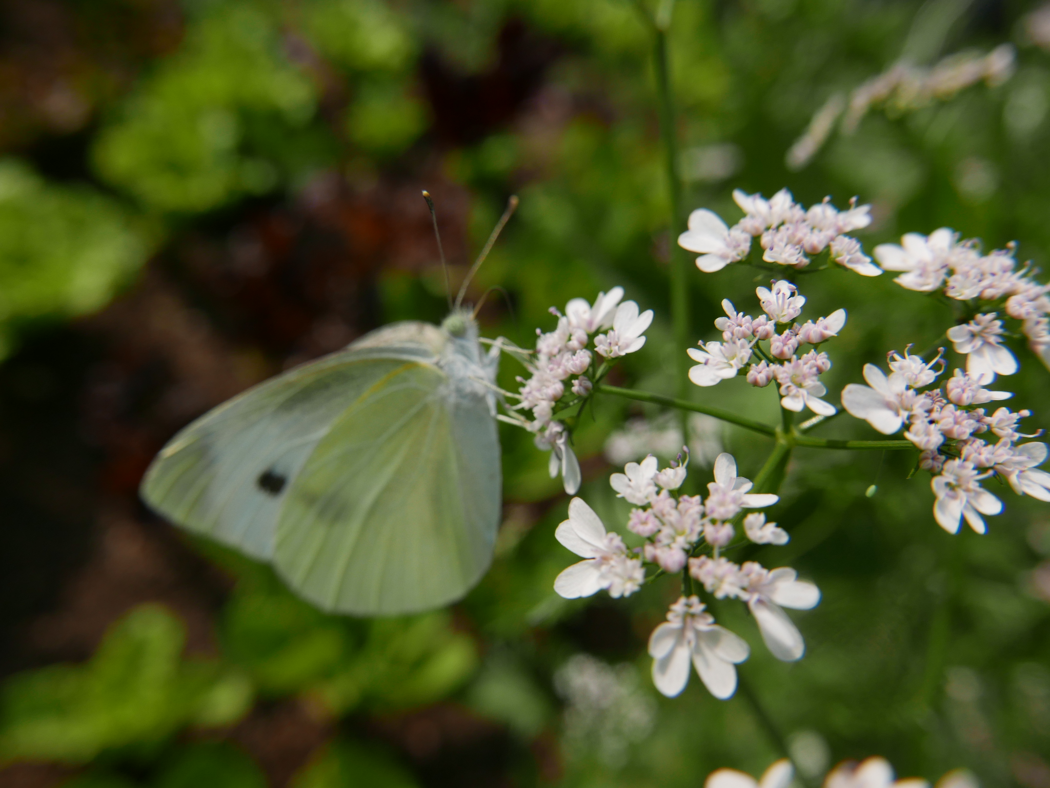 고수에서 핀 꽃향기는 배추흰나비가 좋아하는 향기다. 고수 꽃이 피기 시작하면 주말농장에 있던 나비들은 다 모여든다.