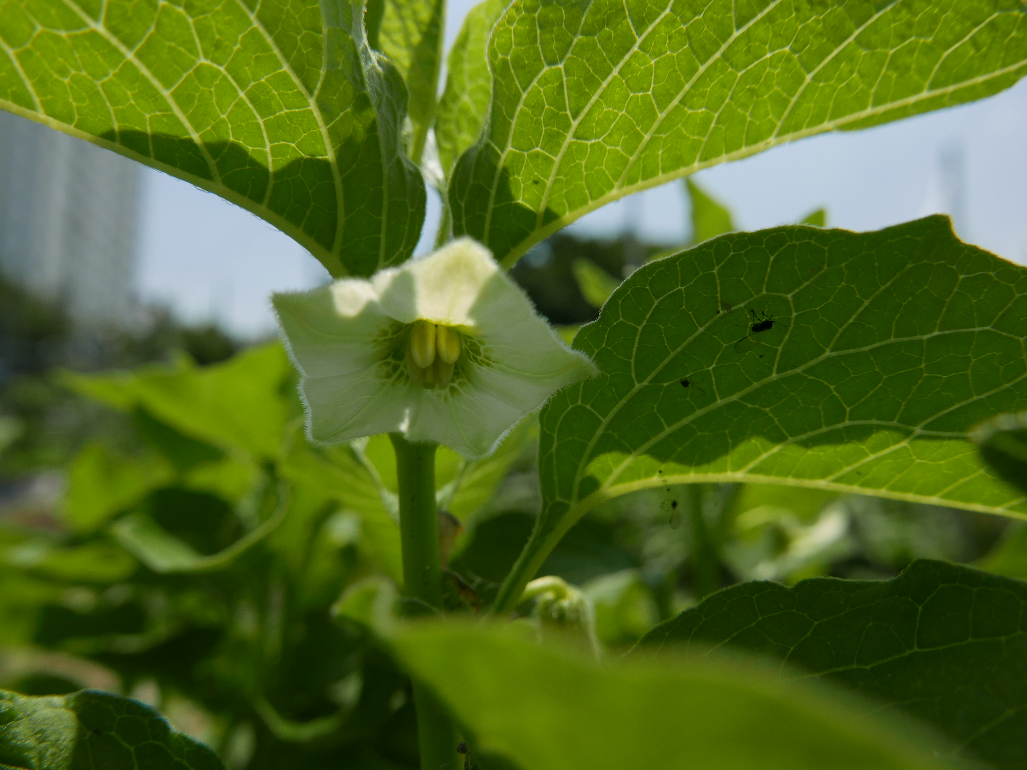 하얀 꽃은 열매에 비해 눈에 띄지 않는다. 하얀 꽃이 넓은 잎 사이에 파묻힌 듯 핀다.