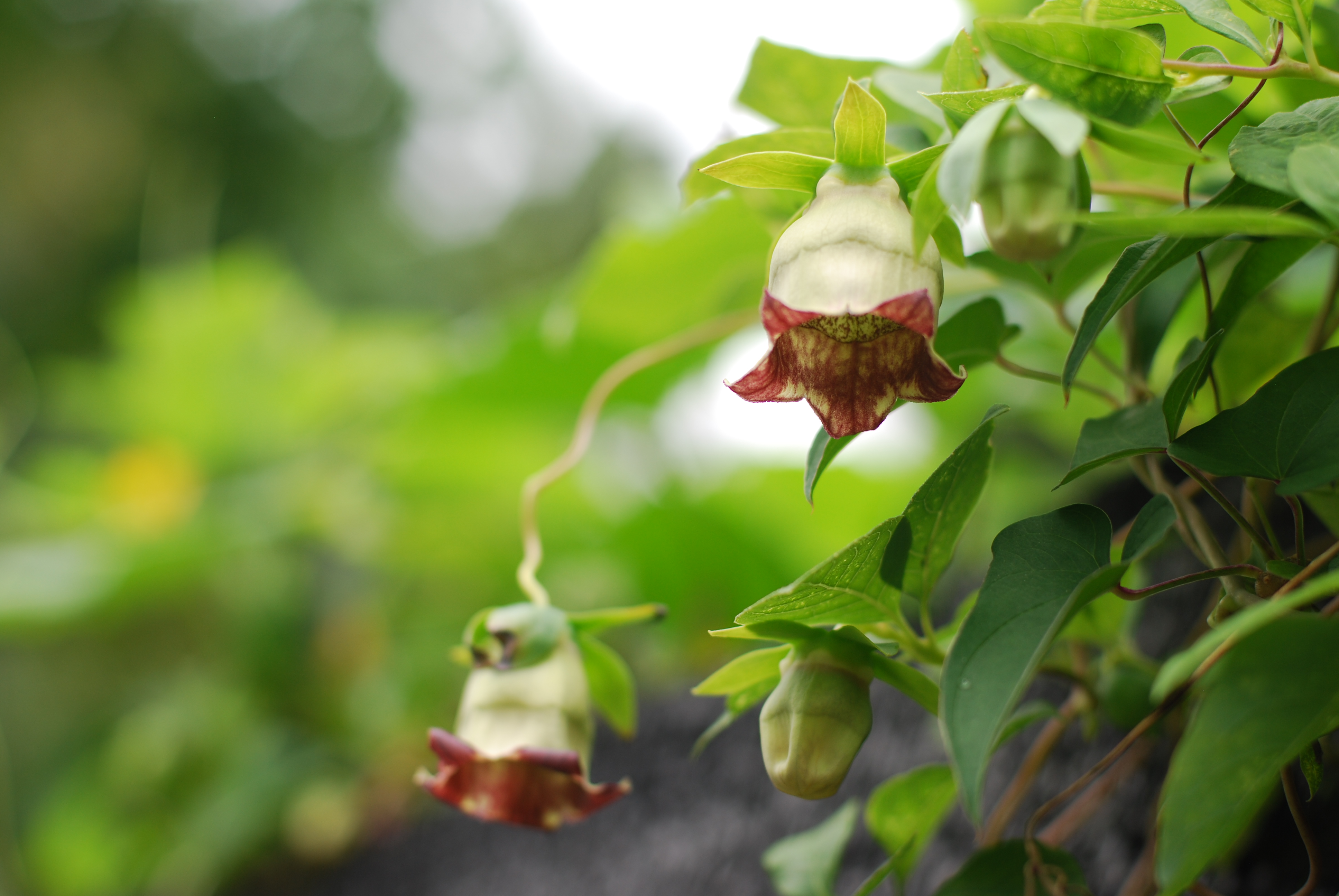 더덕 꽃은 절간에 있어야 할 종 모양이다. 옻칠한 교자상 같은 고풍스런 꽃 색깔이 멋스럽다.